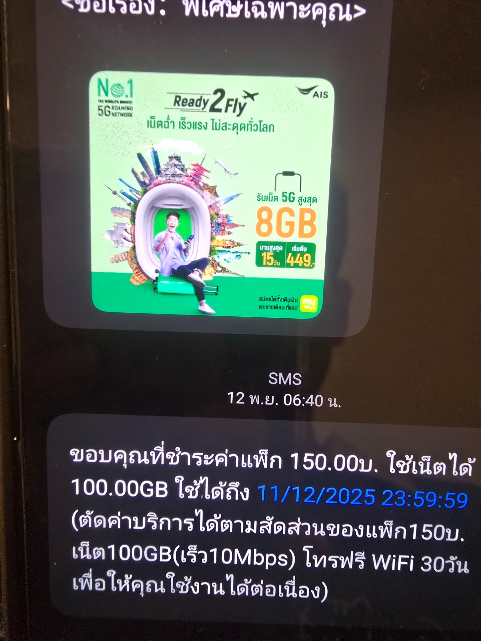 จากเรื่องที่พึ่งย้ายค่าบเบอร์เดิมจาก gomo มา ais ก็ได้มา ais วันที่ 24/11/68 จากนั้นก็สมัครโปรแนะนำในแอพ 280 บาท 5G 25GB 10Mbps WiFi 30 วัน 261.68 ฿ | เดือน ราคารวม VAT 280 ฿ สำหรับคุณ อินเทอร์เน็ต