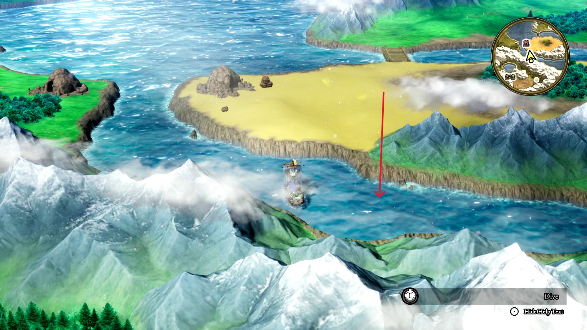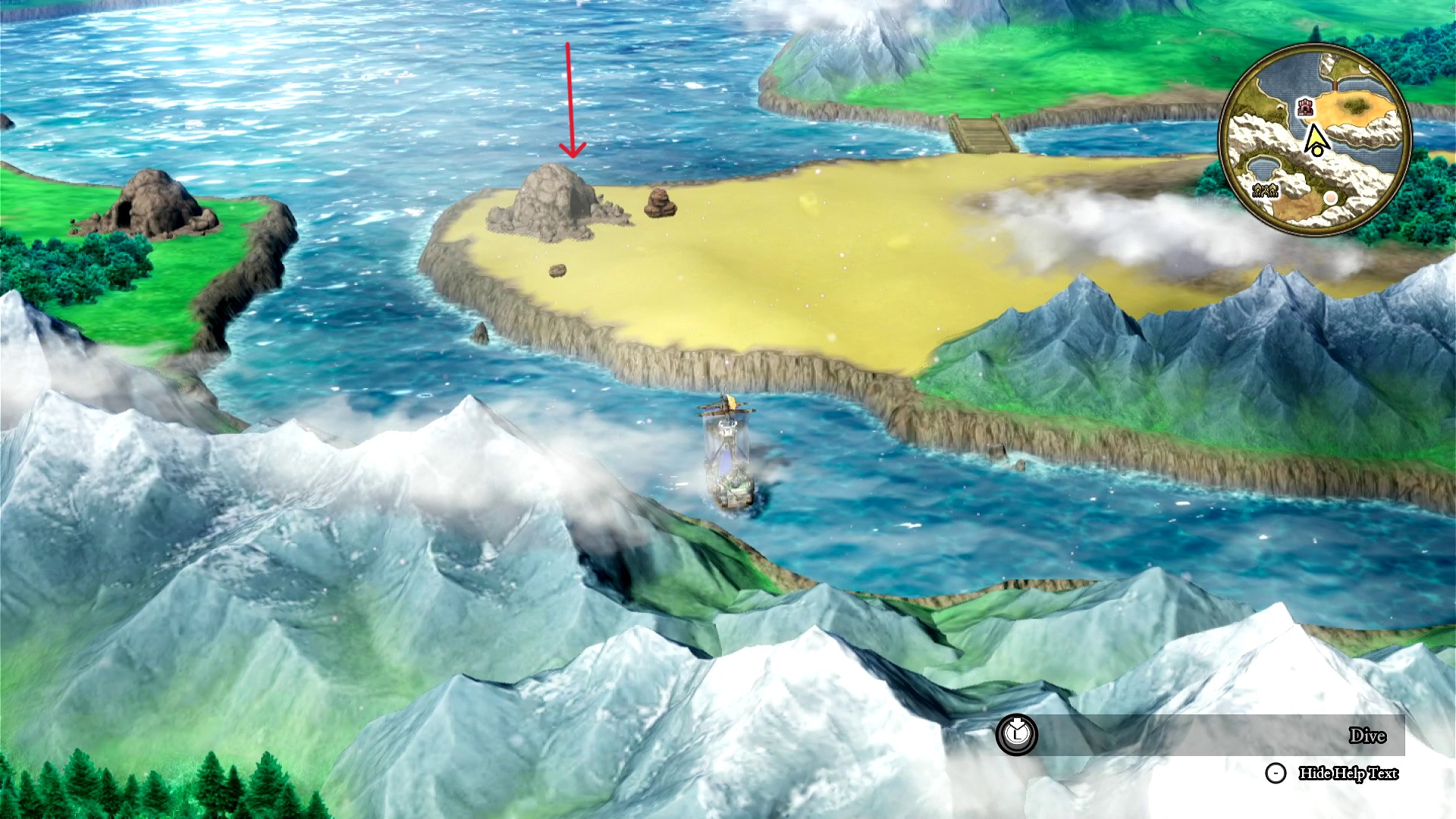 ให้นั่งเรือแล้วใช้ Moonshard ทำลายโขดหินที่อยู่ด้านใต้ของสถานที่ข้างต้น ตามลูกศรแดง