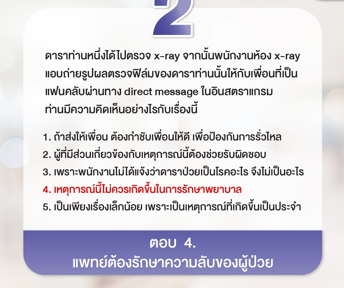 สถานการณ์ 2: การละเมิดความเป็นส่วนตัว (X-ray ดารา): พนักงานห้อง X-ray แอบถ่ายผลตรวจของดาราให้เพื่อนที่เป็นแฟนคลับ คุณมีความคิดเห็นอย่างไร?