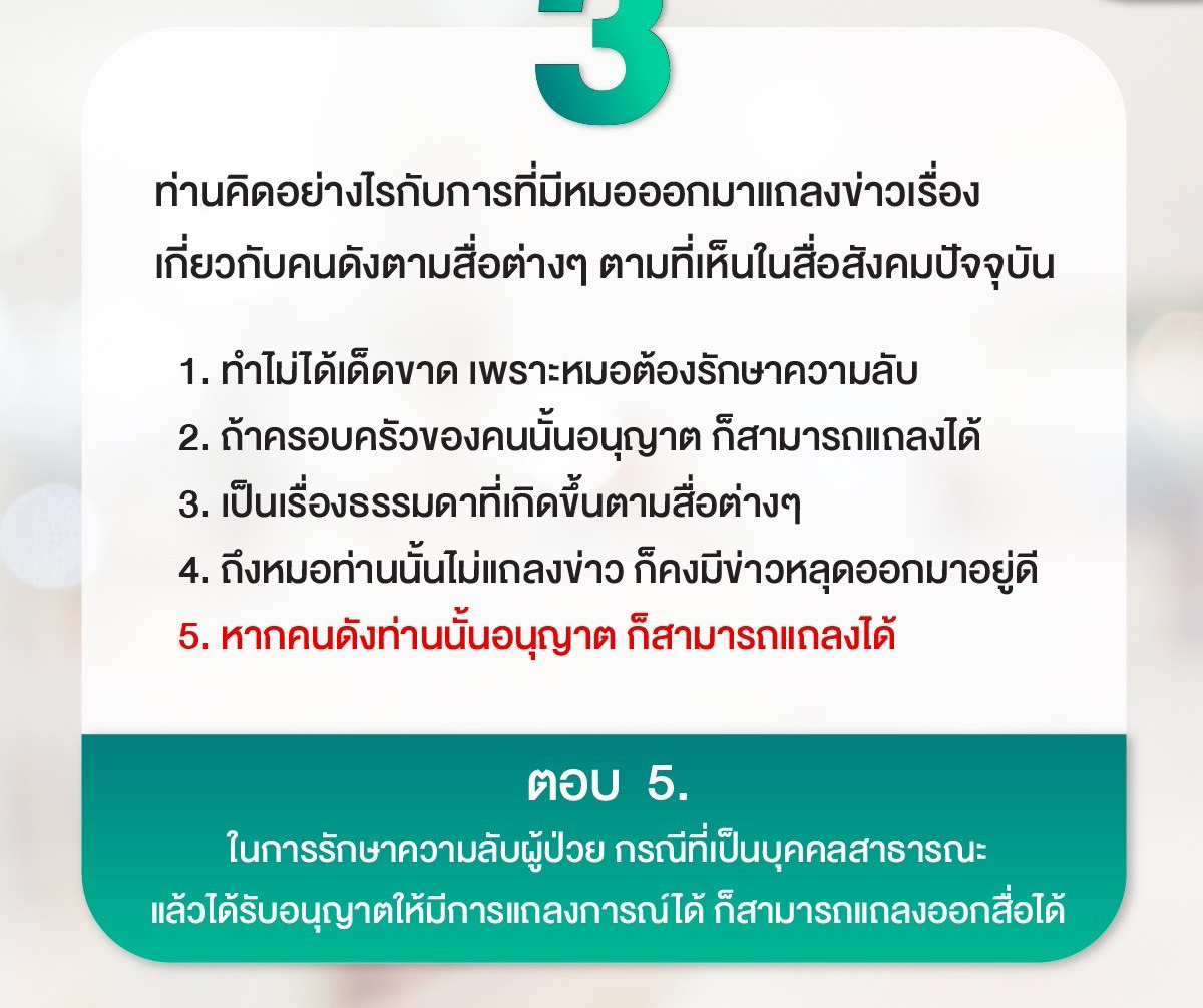 หลักการ: ไม่ตอบข้อมูลใดๆ เพราะแพทย์ต้องรักษาความลับของผู้ป่วย