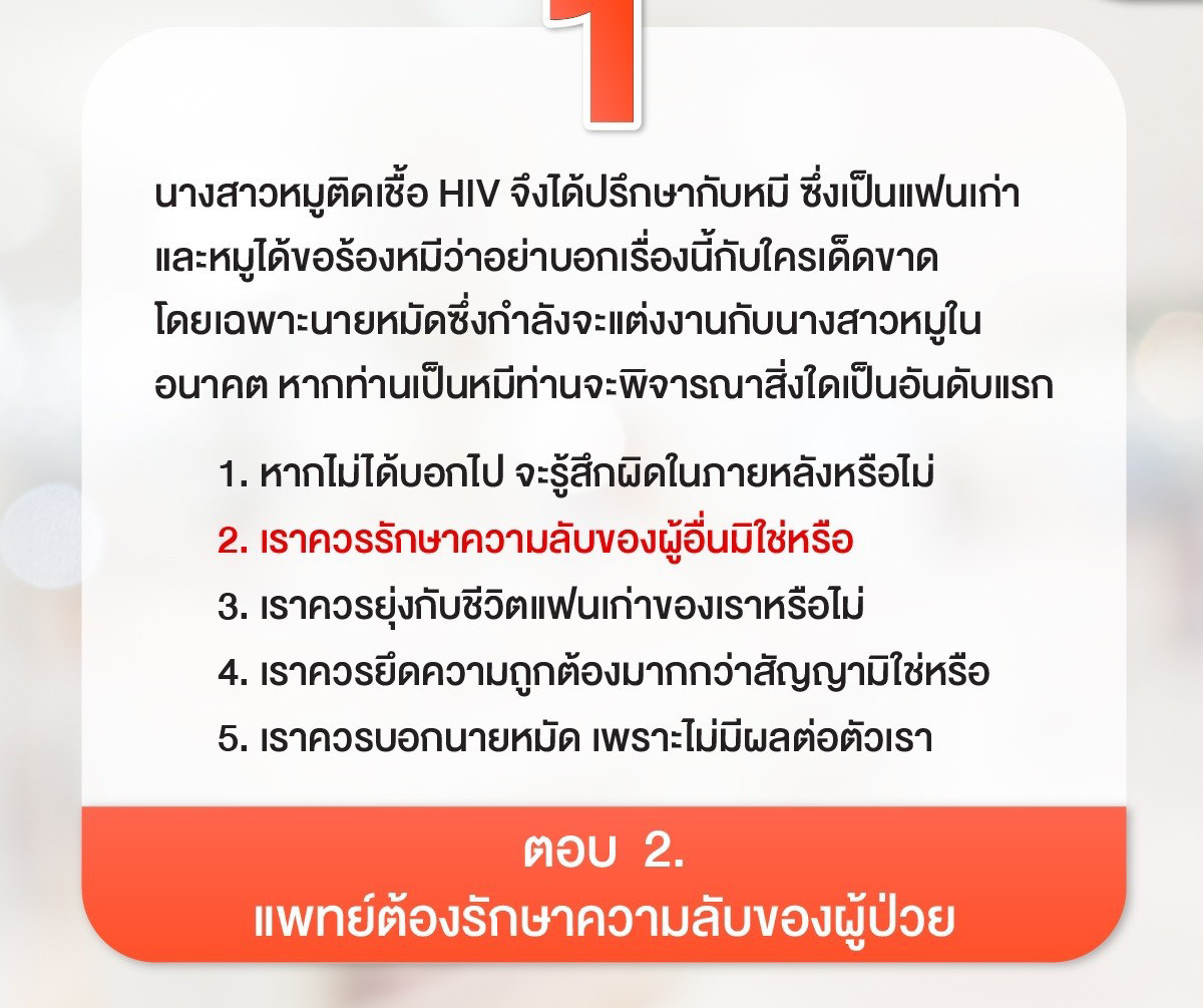 สถานการณ์ 1: ความลับ vs การเปิดเผย (HIV): เพื่อนเก่าติดเชื้อ HIV แต่ขอให้คุณเก็บเป็นความลับ เพราะเขากำลังจะแต่งงานกับแฟนใหม่ คุณจะรักษาความลับหรือบอกแฟนใหม่ของเขา?