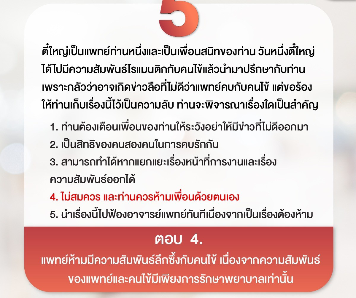 สถานการณ์ 5: ความสัมพันธ์หมอกับคนไข้: เพื่อนคุณที่เป็นแพทย์เกิดความสัมพันธ์โรแมนติกกับคนไข้ที่รักษาอยู่ คุณจะพิจารณาเรื่องนี้อย่างไร?
