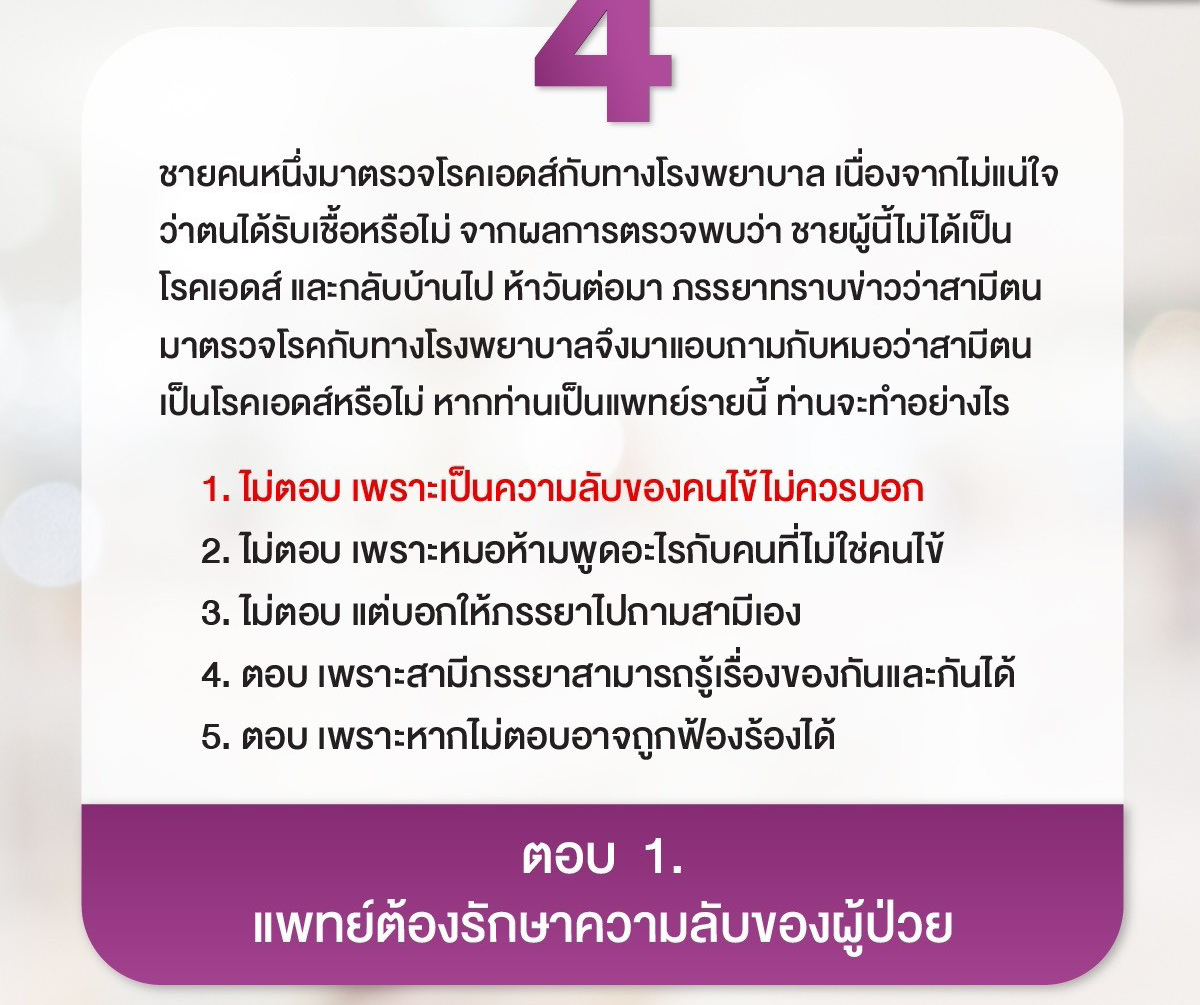 สถานการณ์ 4: ความลับ vs ญาติ (โรคติดต่อ): ภรรยาคนไข้ถามคุณว่าสามีตรวจโรคติดต่อหรือไม่ ทั้งที่สามีไม่ต้องการให้เปิดเผย คุณจะตอบอย่างไร?