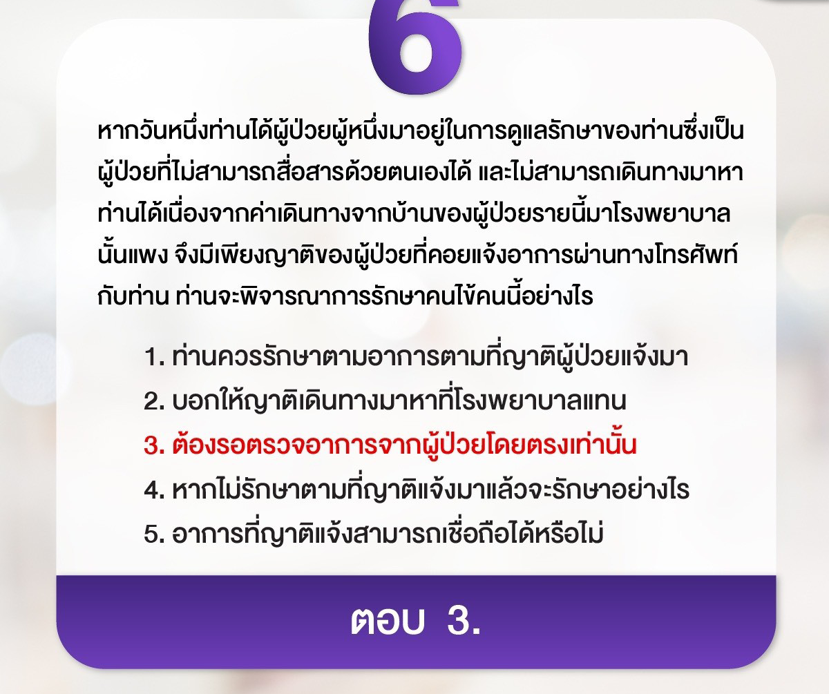 สถานการณ์ 6: การรักษาทางไกล: ผู้ป่วยที่ไม่สามารถเดินทางมาหาคุณได้ และญาติแจ้งอาการผ่านโทรศัพท์ คุณจะพิจารณาการรักษาอย่างไร?