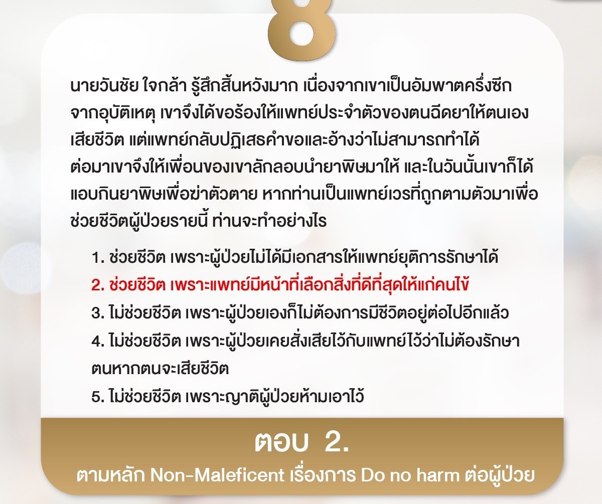 สถานการณ์ 8: สิทธิในการตาย (Euthanasia): ผู้ป่วยอัมพาตครึ่งซีกขอให้แพทย์ฉีดยาให้เขาเสียชีวิต แต่แพทย์ปฏิเสธ ต่อมาเขาแอบกินยาพิษเพื่อฆ่าตัวตาย คุณซึ่งเป็นแพทย์เวรจะช่วยชีวิตเขาหรือไม่?