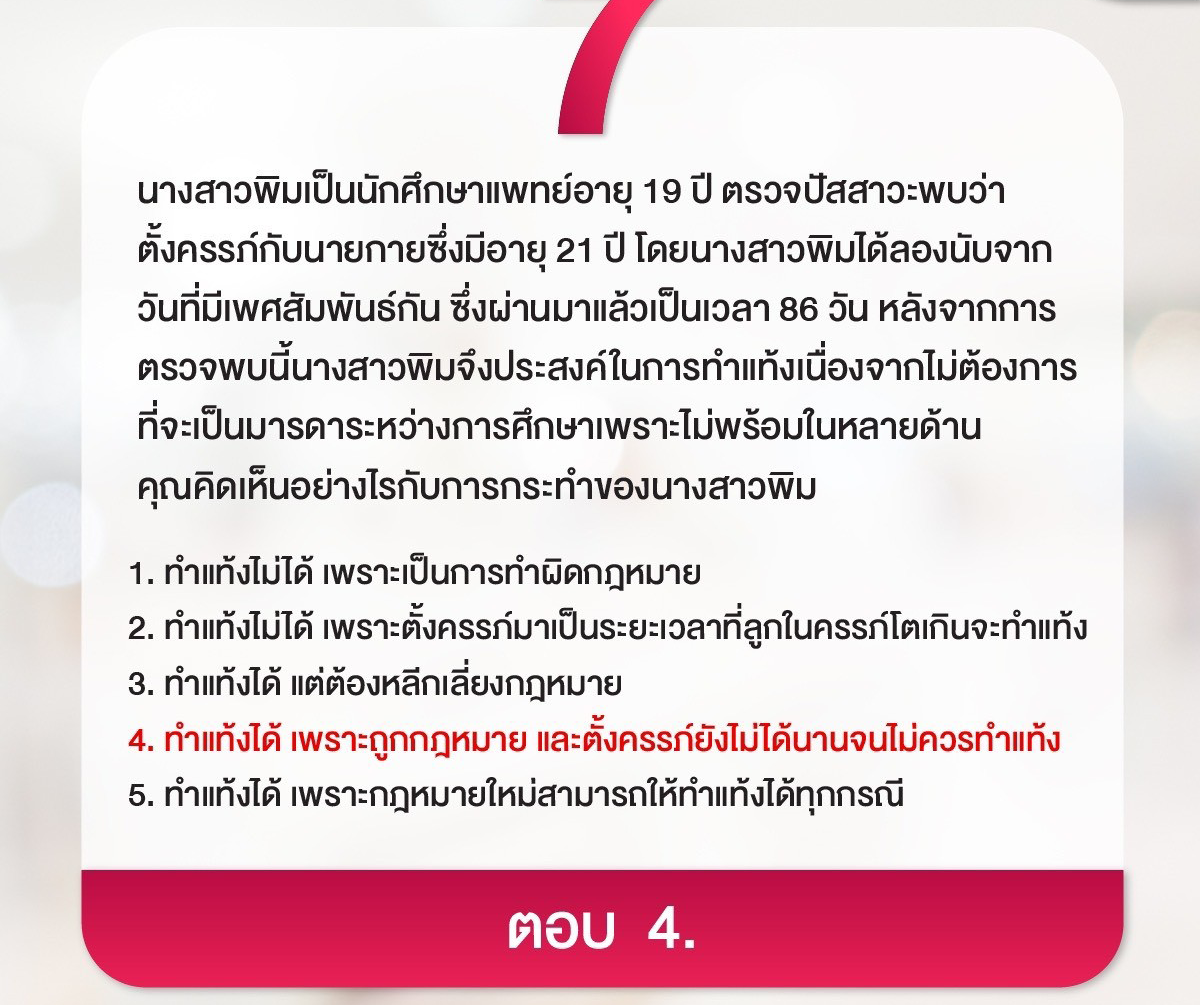 สถานการณ์ 7: การทำแท้ง: นักศึกษาแพทย์ท้องนอกสมรส 86 วัน และต้องการทำแท้งเพื่อเรียนต่อ คุณคิดอย่างไรกับการกระทำของเธอ?