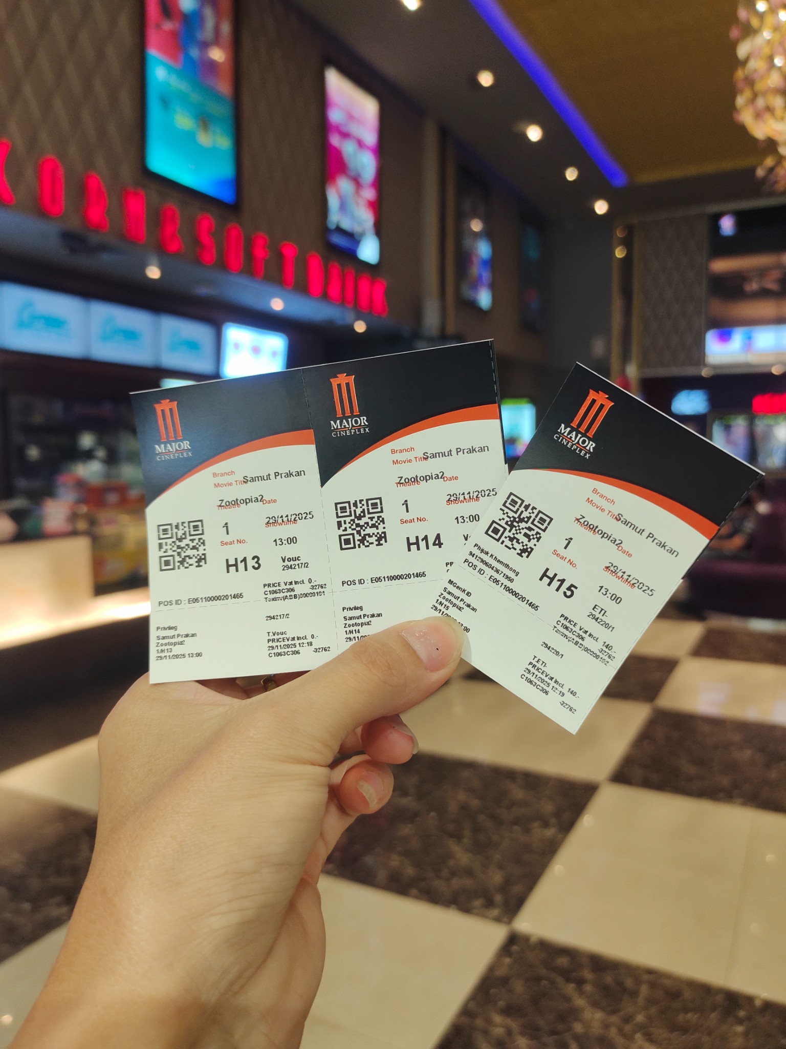 👉🏻 พอถึงวันและเวลาก็มาถึงก่อนเวลาครึ่งชั่วโมง 🕧 สาขานี้ค่อนกว้างและสะอาดเหมือนเคย 🪪 เราใช้ตั๋วฟรีจากงาน อว.แฟร์ 2 ใบ 🚀 และใช้สิทธิ์ Major Kids จากที่นั่งละ 200.- บาท 💸 ลดเหลือ 140.- บาท ได้รอบ 13.00 น. โรง 1 ที่นั่ง H13 , H14 , H15 📽️⭐👍🏻