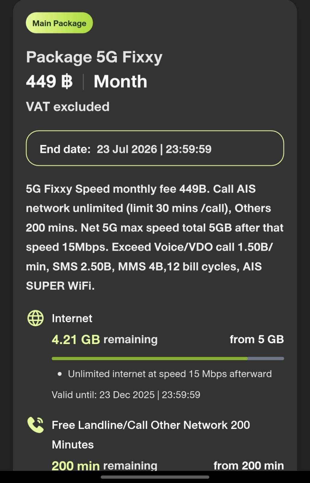 คือผมใช้แพ็คเกจ internet และ โทร ของ ais อยู่ที่ราคา 399 รวม Vat. 426.93 จ่ายแบบนี้มาจะ 3 ปีแล้ว แล้วมาวันนี้ยอดใหม่แจ้งว่าผมต้องชำระทั้งสิ้น 581.01 บอกว่ามีค่าบริการส่วนเกิน 144 บาท ซึ่งตัวผมเองไม่ได