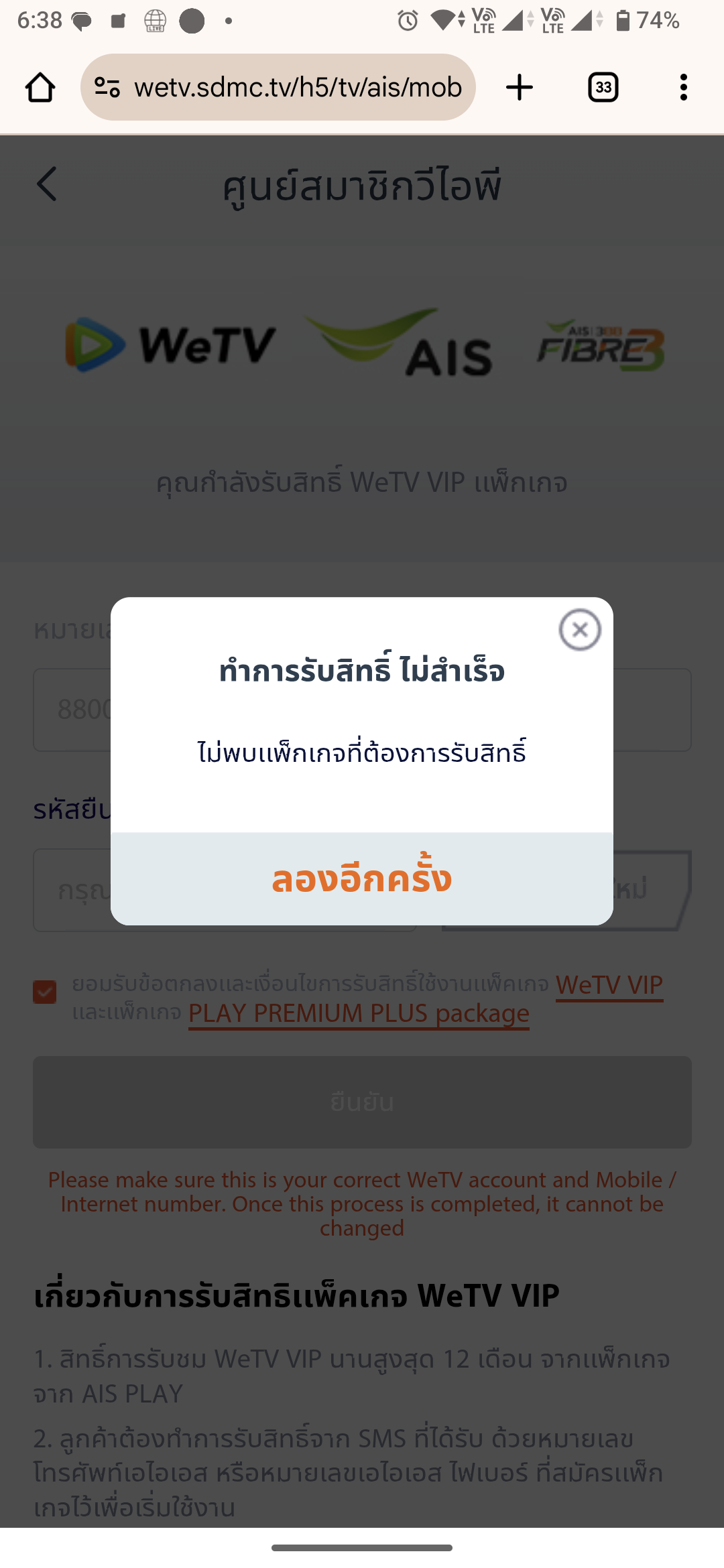 สมัคร Wetv ด้วยเลข Ais fibre แต่ผูกบัญชีไม่ได้ แก้ยังไงครับ