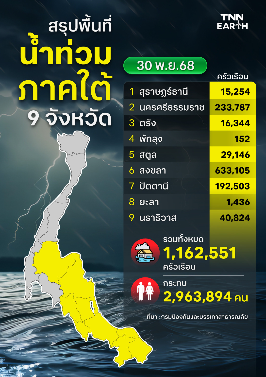 สรุปพื้นที่น้ำท่วมภาคใต้ 9 จังหวัด 30 พ.ย 68