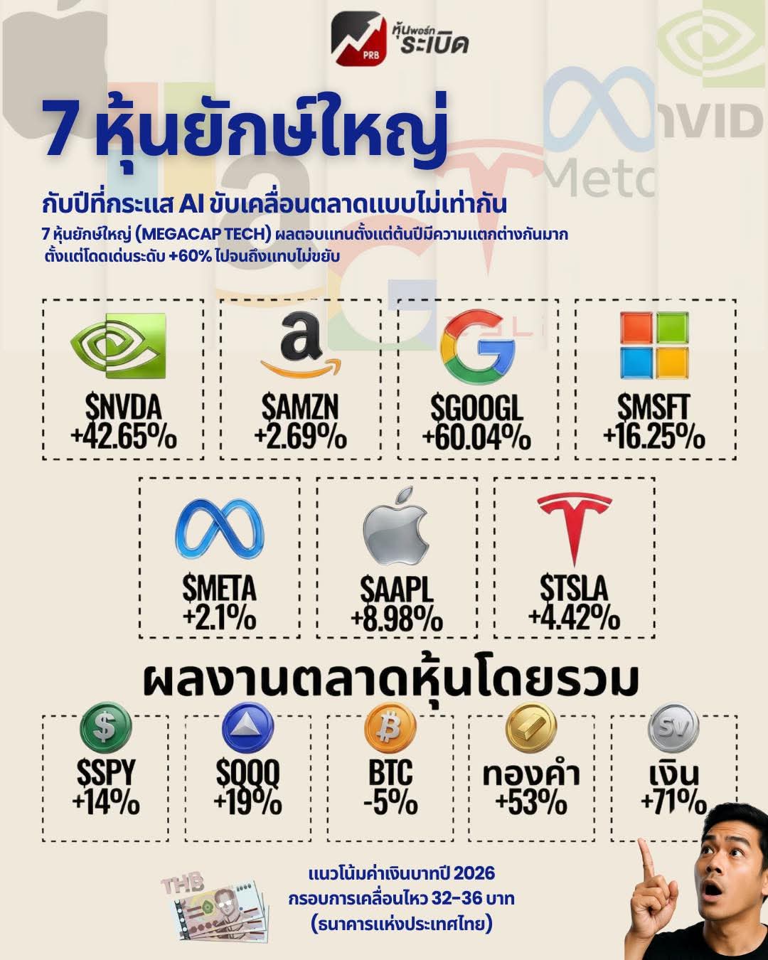 ภาพรวมทั้งปีสะท้อนให้เห็นว่าตลาดไม่ได้ขึ้นเป็นหน้ากระดานเดียวอีกต่อไป แต่ “เลือกให้รางวัลเฉพาะบริษัทที่ชนะในสมรภูมิ AI” โดยเฉพาะผู้เล่นที่มี Control บน Infrastructure เช่น Google, Nvidia, Microsoft