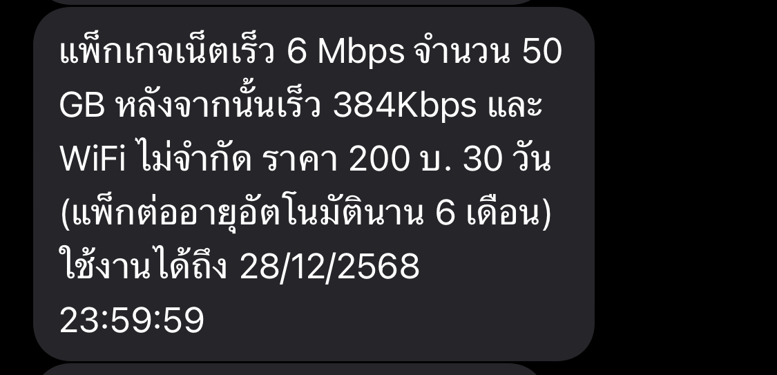 แพ็กเกจหลักทรูมูฟ เอชของคุณคือ 5G Special Max Speed 300 โทร 100 นาที เน็ต 30GB (FUP 4 Mbps) ค่าโทรส่วนเกิน1.50บ./นาที SMS 2.5บ. MMS 4.5บ. สิ้นสุดวันที่ 24-ก.ค.-68 เวลา 23:59:59 เริ่มรอบบิลใหม่ทุกวันที