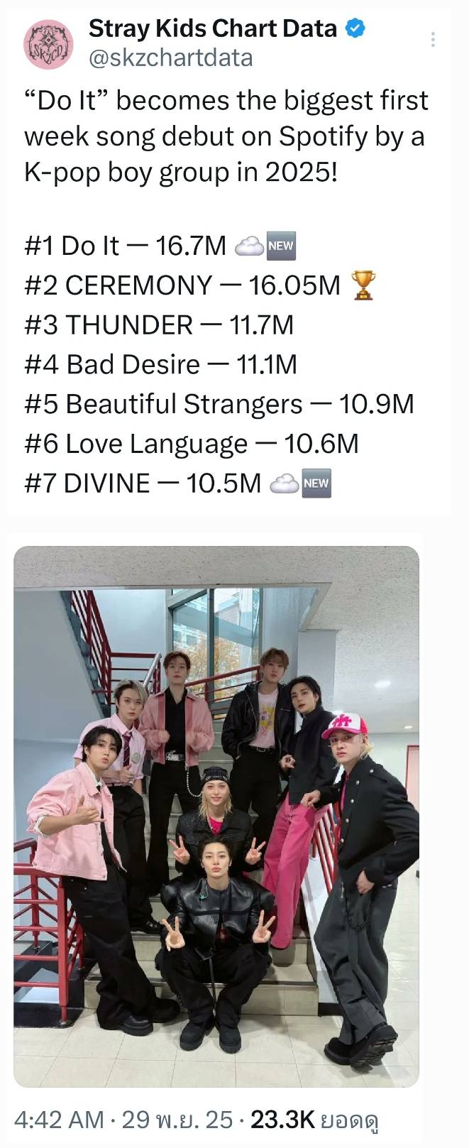 🔥 Stray Kids "DO IT" เปิดตัวอันดับ 42 บน Spotify Global เพลงเปิดตัวสัปดาห์แรกที่ยิ่งใหญ่ที่สุดโดยบอยแบนด์ K-pop ปี 2025