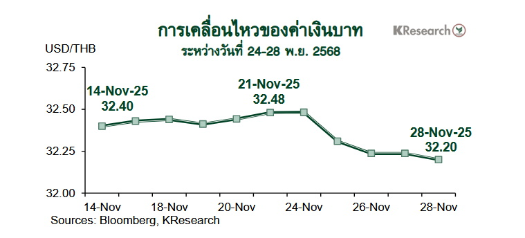 ในวันศุกร์ที่ 28 พ.ย. 2568 เงินบาทปิดตลาดในประเทศที่ 32.20 บาทต่อดอลลาร์ฯ เทียบกับระดับ 32.48 บาทต่อดอลลาร์ฯ ในวันศุกร์ก่อนหน้า (21 พ.ย.) สำหรับสถานะพอร์ตการลงทุนของนักลงทุนต่างชาติระหว่างวันที่ 24-28 พ.ย. 2568 นั้น นักลงทุนต่างชาติขายสุทธิหุ้นไทย 1,119 ล้านบาท แต่มีสถานะอยู่ในฝั่ง Net Inflows เข้าตลาดพันธบัตรไทย 9,774 ล้านบาท (ซื้อสุทธิพันธบัตร 10,099 ล้านบาท หักตราสารหนี้หมดอายุ 325 ล้านบาท)