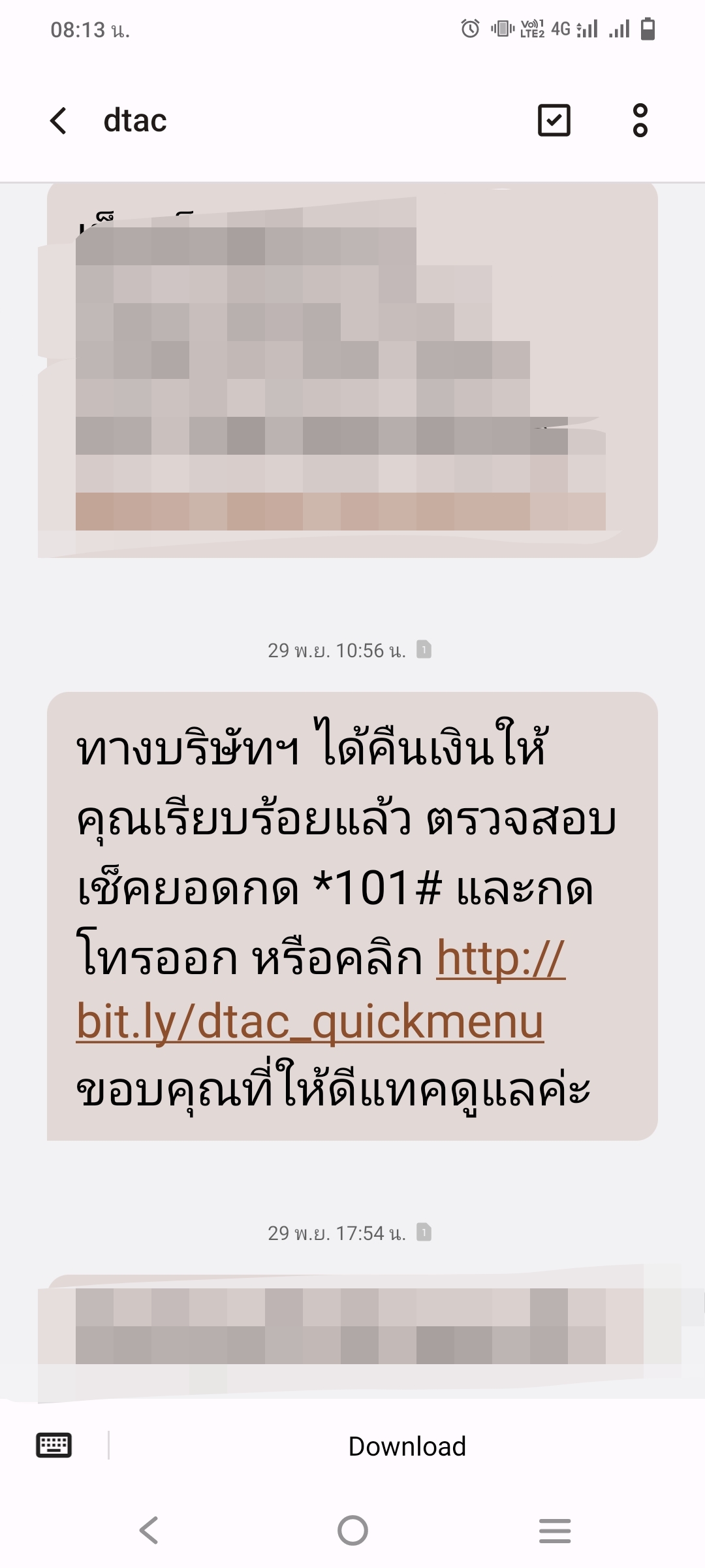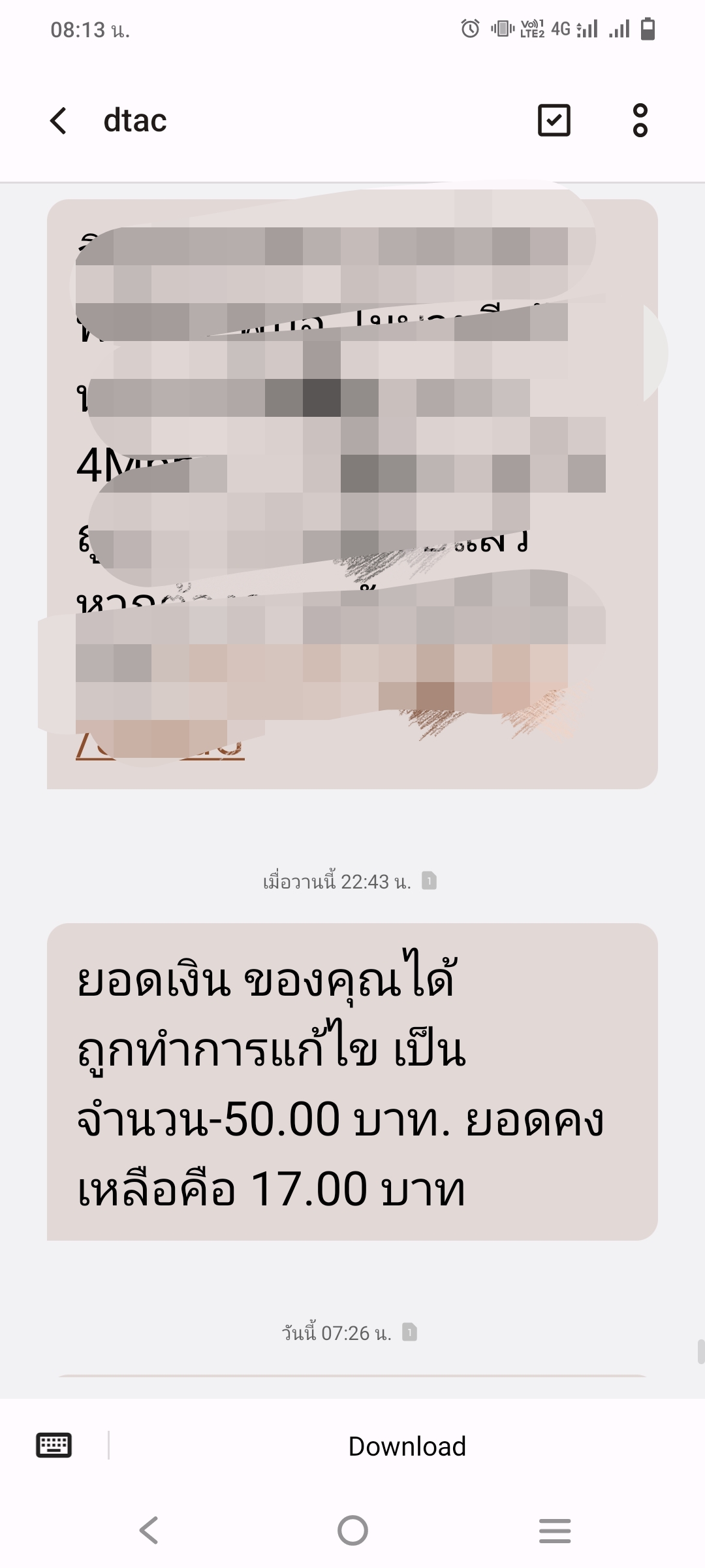 https://pantip.com/topic/43871763 จากกระทู้แรกที่เคยเขียนไปเรื่องเติมเงิน DTAC แล้วเงินไม่เข้า หลังจากโพสต์กระทู้ไปครบ 24 ชั่วโมงที่เราติดตามกับน้องฟ้าหลังไมค์ วันที่ 29 dtac ได้มีเงินคืนมา 50 บาท และเมื่อคืนนี้ตอน 22:43 น แต่เราเพิ่งมาเห็นตอนเช้า dtac มีข้อความมาว่าได้หักเงินออกจากของเรา 50 บาท ซึ่งงงมากก็หมายความว่ายังไง เงินที่เติมไปเราก็ไม่ได้ แต่พอเราโพสต์กระทู้คืนเงินให้เรามาแต่ก็มาดึงเงินเราคืนกลับไปอีก