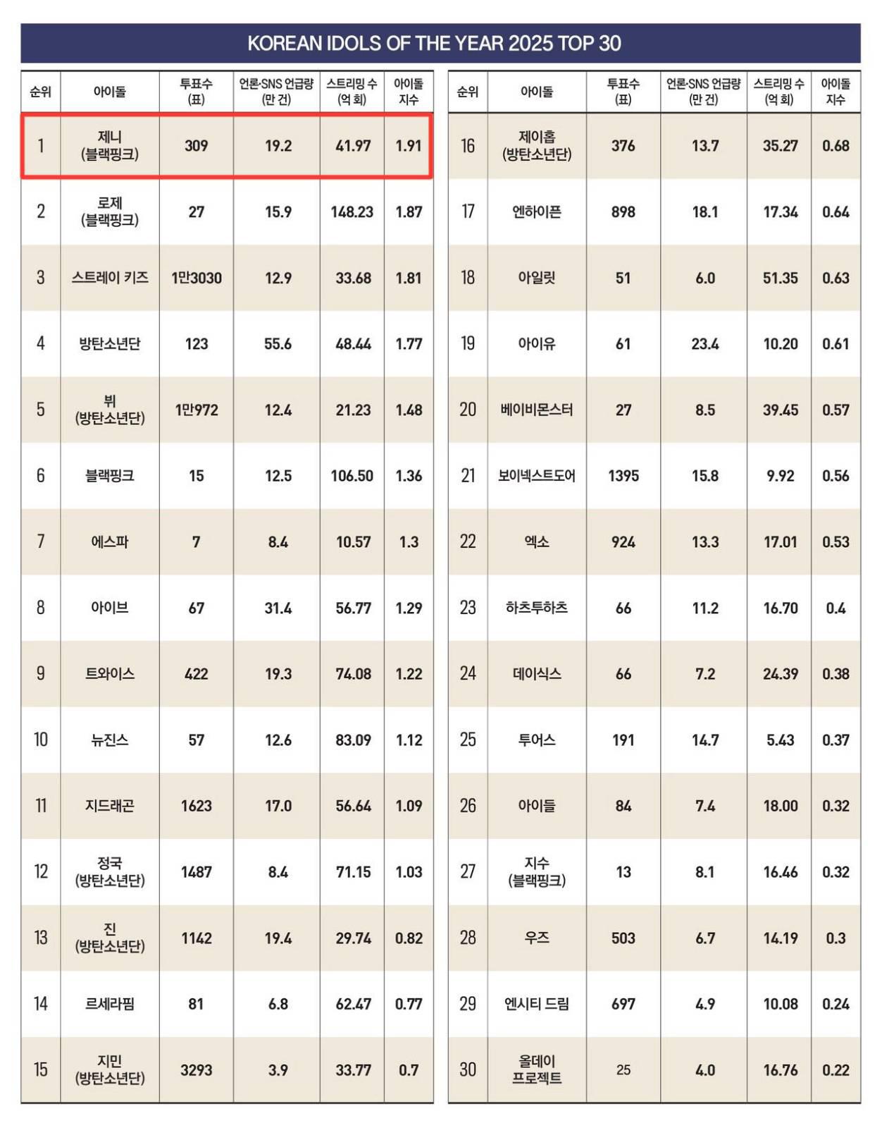 เจนนี่ BLACKPINK คว้าตำแหน่งไอดอลอันดับหนึ่งในการประกาศรางวัล "ไอดอลเกาหลีแห่งปี" ประจำปีนี้ การที่เจนนี่ขึ้นสู่อันดับหนึ่งไม่ได้มาจากความสำเร็จใดๆ เป็นพิเศษ แต่มาจากการที่เธอติดอันดับสูงอย่างต่อเนื่องในทุกตัวชี้วัด ทั้งการสตรีมเพลง การถูกกล่าวถึงในสื่อและโซเชียลมีเดีย และการโหวตของแฟนๆ ซึ่งน่าจะเป็นผลมาจากการที่เจนนี่ได้เผยแพร่ผลงานในสื่อต่างๆ อย่างต่อเนื่อง ทั้งแฟชั่น การร่วมงานกับแบรนด์ระดับโลก วงการบันเทิง และอื่นๆ