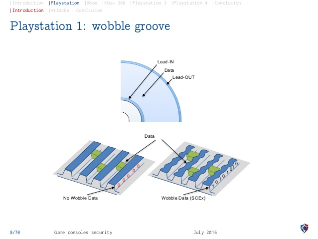 wobble groove แบบสรุปสั้น ๆ ก็คือพื้นที่วงในสุดของ CD ที่ Sony ทำการปั้มหรือ Burn แผ่นให้เป็นลูกคลื่นเพื่อเก็บข้อมูล region หรือโซนที่วางจำหน่ายเกม ในระดับกายภาพลงไปในแผ่น CD ซึ่ง wobble groove นี้ไม่สามารถสร้างเลียนแบบได้ด้วยเครื่องเขียนแผ่น CD ทั่วไป