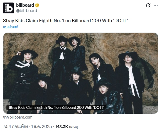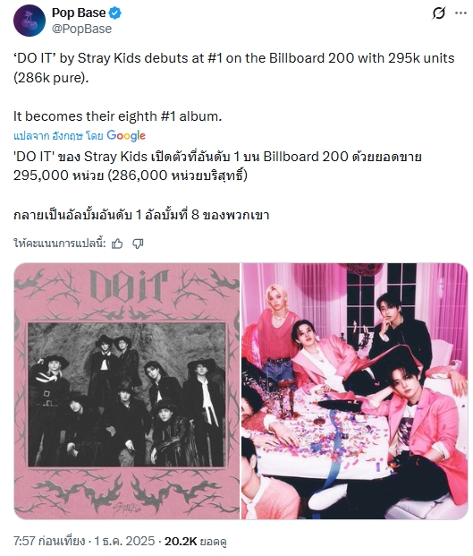 🔥 Stray Kids "DO IT" เปิดตัวที่อันดับ 1 บน Billboard 200 ประจำสัปดาห์นี้ด้วยยอดขาย 295,000 หน่วย (ยอดขายอัลบั้มจริง 286,000 แผ่น กับ