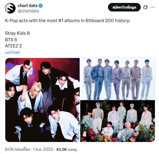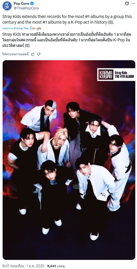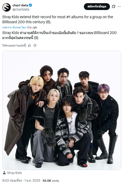 - Stray Kids เป็นศิลปิน K-Pop ที่มีอัลบั้มอันดับ 1 บน Billboard 200 มากที่สุด