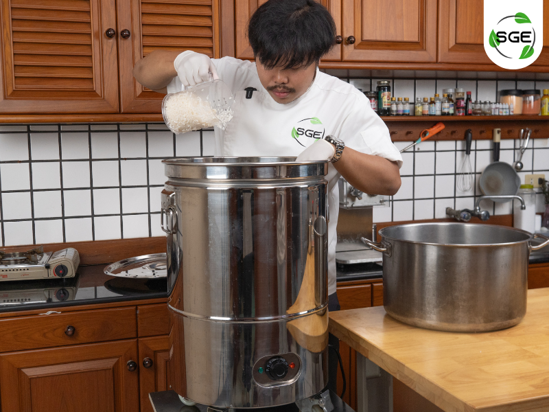 หุงข้าวเหนียวด้วยหม้อหุงข้าวอัตโนมัติตั้งอุณหภูมิประมาณ 110°C ใช้เวลาประมาณ 2–3 ชั่วโมงงง