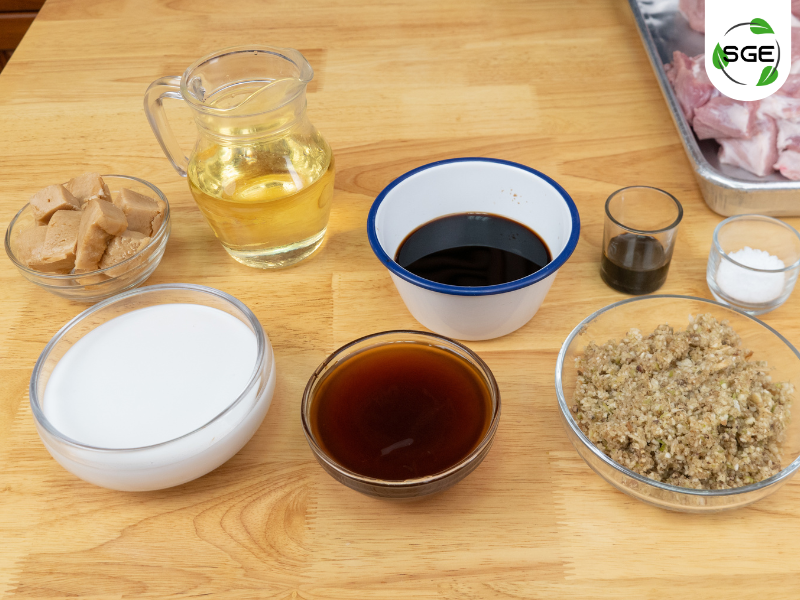 เตรียมอ่างผสมใส่เครื่องปรุง ได้แก่ สามเกลอ ซอสปรุงรส ซอสหอยนางรม น้ำตาลปี๊บ เกลือป่น ซีอิ๊วดำ น้ำมันพืช และกะทิลงไป จากนั้นใช้มือหรือทัพพีคนน้ำหมักให้เข้ากันจนน้ำตาลละลายดีเลยนะะ