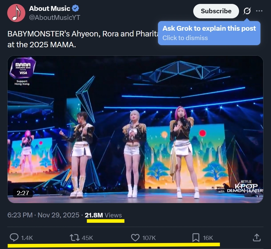 ไม่ใช่ยอด Engagement ใน Youtube เท่านั้น แต่ในทุกแอฟ ล้วนแล้วแต่มียอดวิว ยอด comment ทั้งชอบ และไม่ชอบเต็มไปหมด ถ้ามองในเชิงธุรกิจแล้ว ตอนนี้ต้องบอกว่าวงที่เรียกยอด Engagement ได้ดีที่สุดในช่วงงาน Mama ก็มี Babymonster เป็นหนึ่งในนั้นเลย