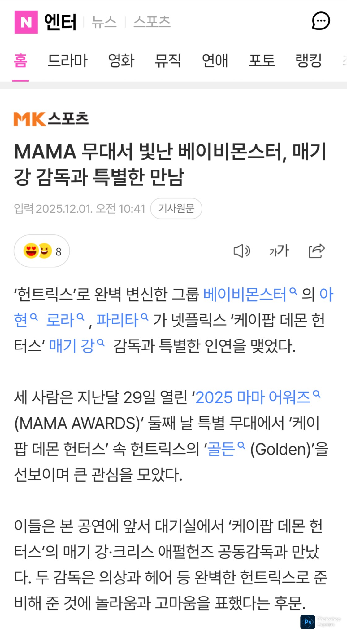บทความจาก NAVER "BABYMONSTER เปล่งประกายบนเวที MAMA AWARDS 2025" และระบุว่าลูกสาว Maggie Kang เป็นแฟน BABYMONSTER ด้วย