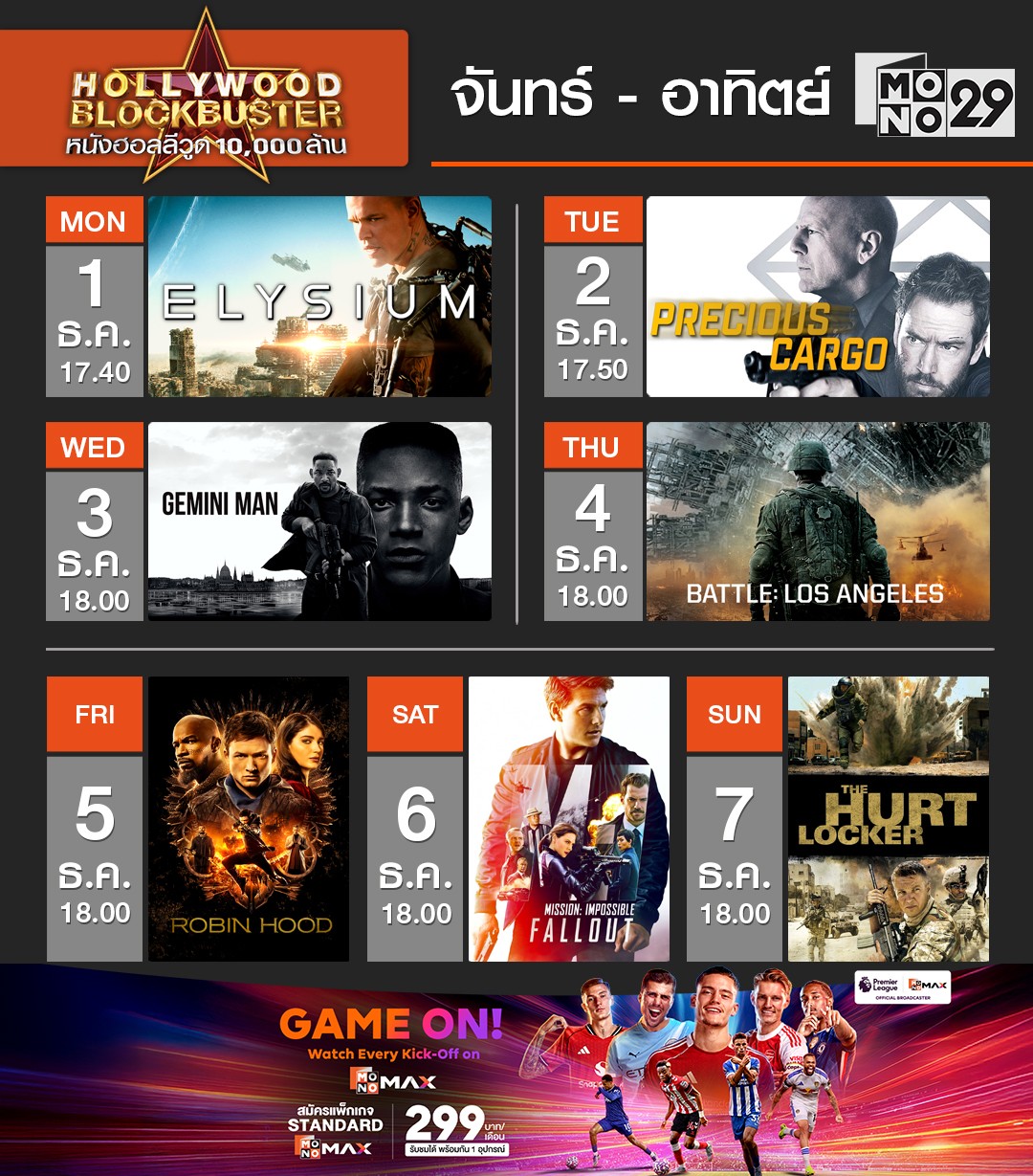 Hollywood Blockbuster หนังฮอลลีวูด 10,000 ล้าน วันที่ 1 - 7 ธันวาคม เวลา 18.00 น. ทางช่อง MONO29