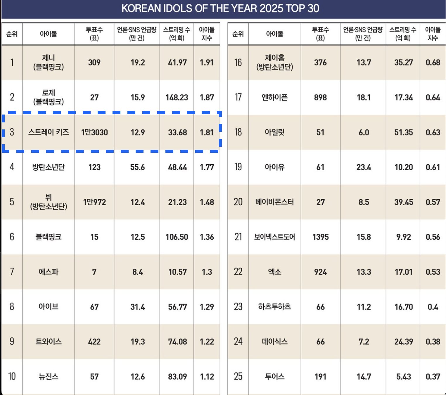 🔥 Stray Kids ได้รับการจัดอันดับให้เป็นวง K-pop อันดับ 1 ประจำปี 2025 โดย Forbes Korea (และ #3 โดยรวม) โดยถือเป็นกลุ่มศิลปิน K-pop ที่ทำอันดับได้สูงที่สุด ‘Top 30 K-Idols of the Year’ โดยพิจารณาจากการสตรีมเพลง 50% การกล่าวถึงในสื่อและโซเชียลมีเดีย 30% และคะแนนโหวตจากแฟนๆ 20%
