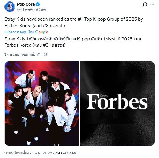🔥 Stray Kids ได้รับการจัดอันดับให้เป็นวง K-pop อันดับ 1 ปี 2025(#3 overal) “Top 30 K-Idols of the Year”โดย Forbes Korea