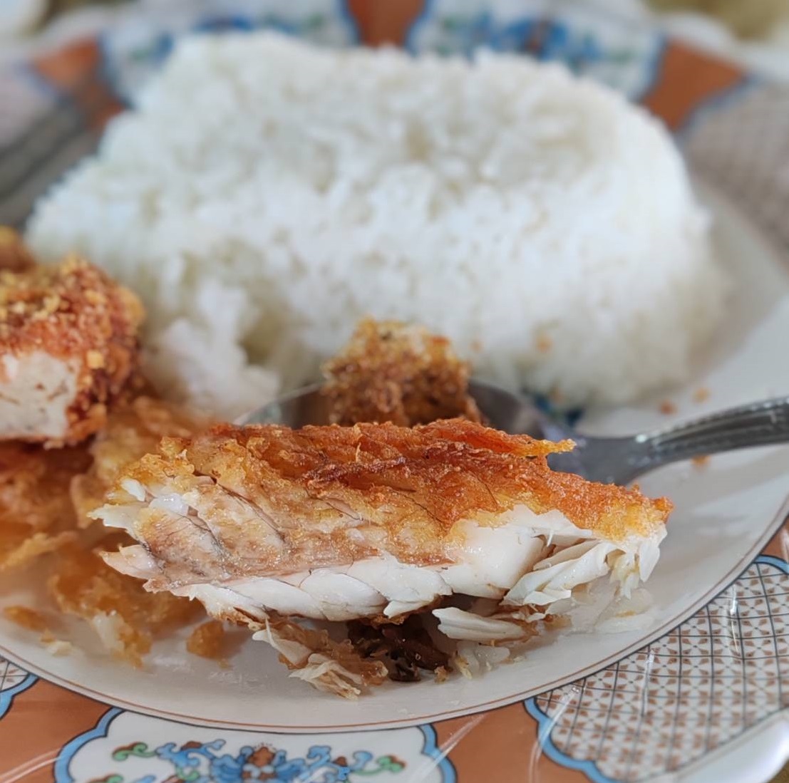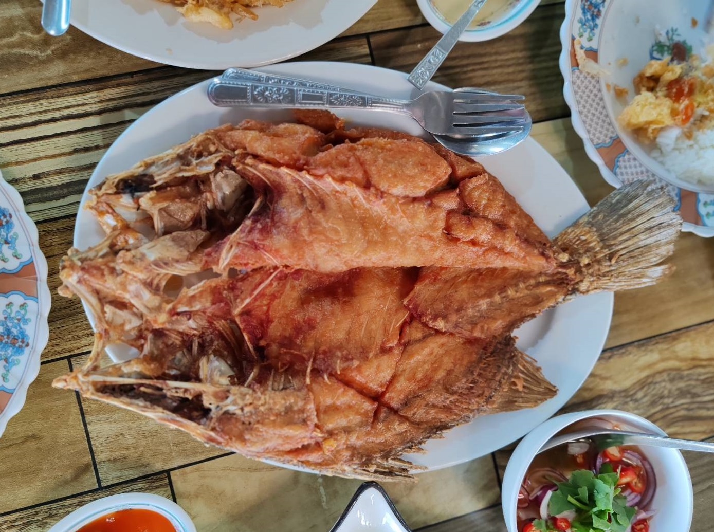 ปลากะพงทอดน้ำปลา 320.- ตัวใหญ่มาก (สังเกตขนาดจากช้อน-ส้อม)