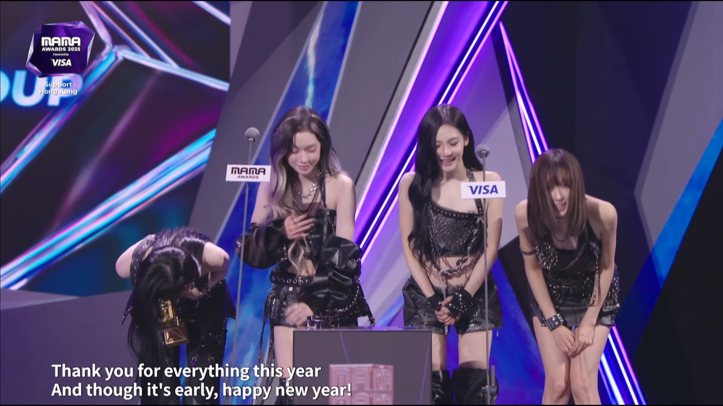 WINTER: สุดท้ายนี้ MY! ขอบคุณทุกคนมากๆ ค่ะ ปีที่แล้วเราก็รู้สึกขอบคุณพวกคุณมากๆ เช่นกัน และปีนี้เราก็ได้รับรางวัลอันทรงเกียรตินี้เช่นกัน ขอบคุณสำหรับเกียรติอันวิเศษนี้อีกครั้งนะคะ เราจะแสดงด้านที่ดีกว่าของเราออกมาในปีหน้าเช่นกัน หวังว่าคุณจะติดตามชมนะคะ! เราจะพัฒนาและต่อยอดตัวเองต่อไป ขอบคุณสำหรับทุกสิ่งในปีนี้คะ