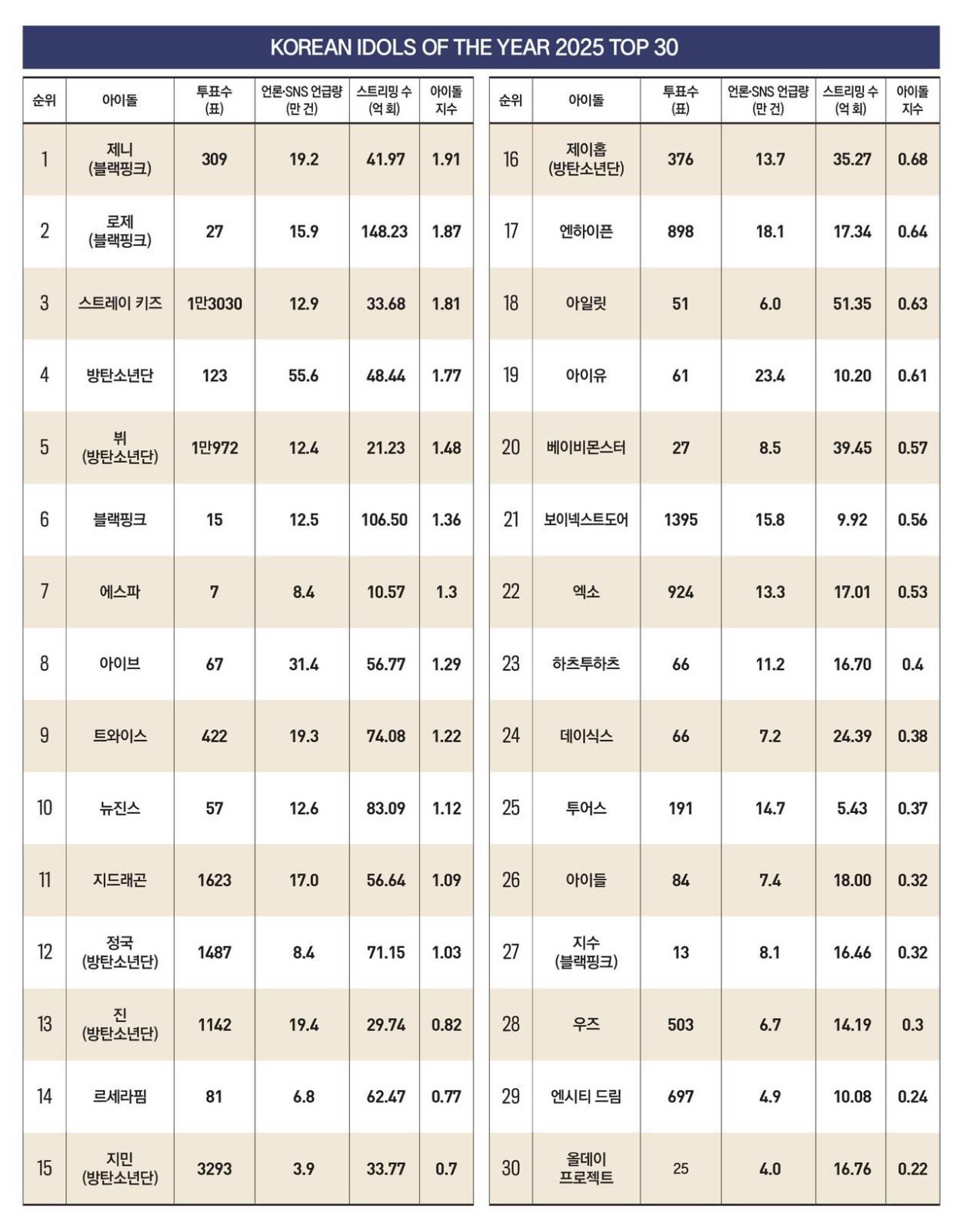 อันดับรวมไอดอลเกาหลีแห่งปี 2025