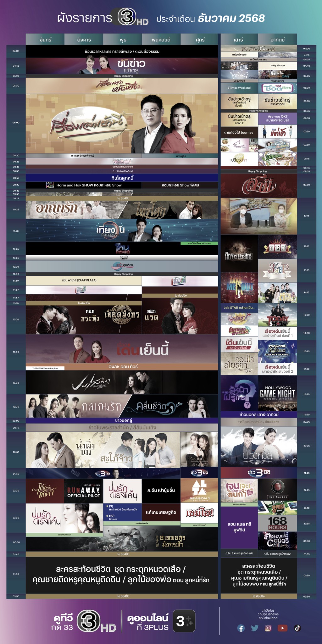📌🔴 ผังรายการช่อง 3HD ประจำเดือน ธันวาคม 2568 📌🔴 📌 ละครหลังข่าว (20.30 - 21.45 น.) วันจันทร์ - พฤหัสบดี ⏭️ ละ