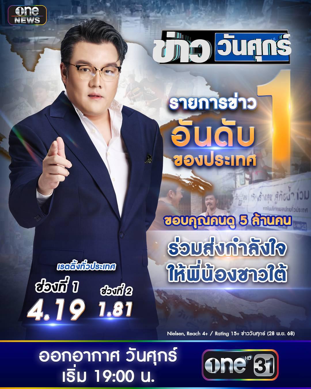 เรตติ้งข่าววันศุกร์(One31) ได้ไป 4.2 ส่งขึ้นเป็นรายการข่าวอันดับ 1 ของประเทศ