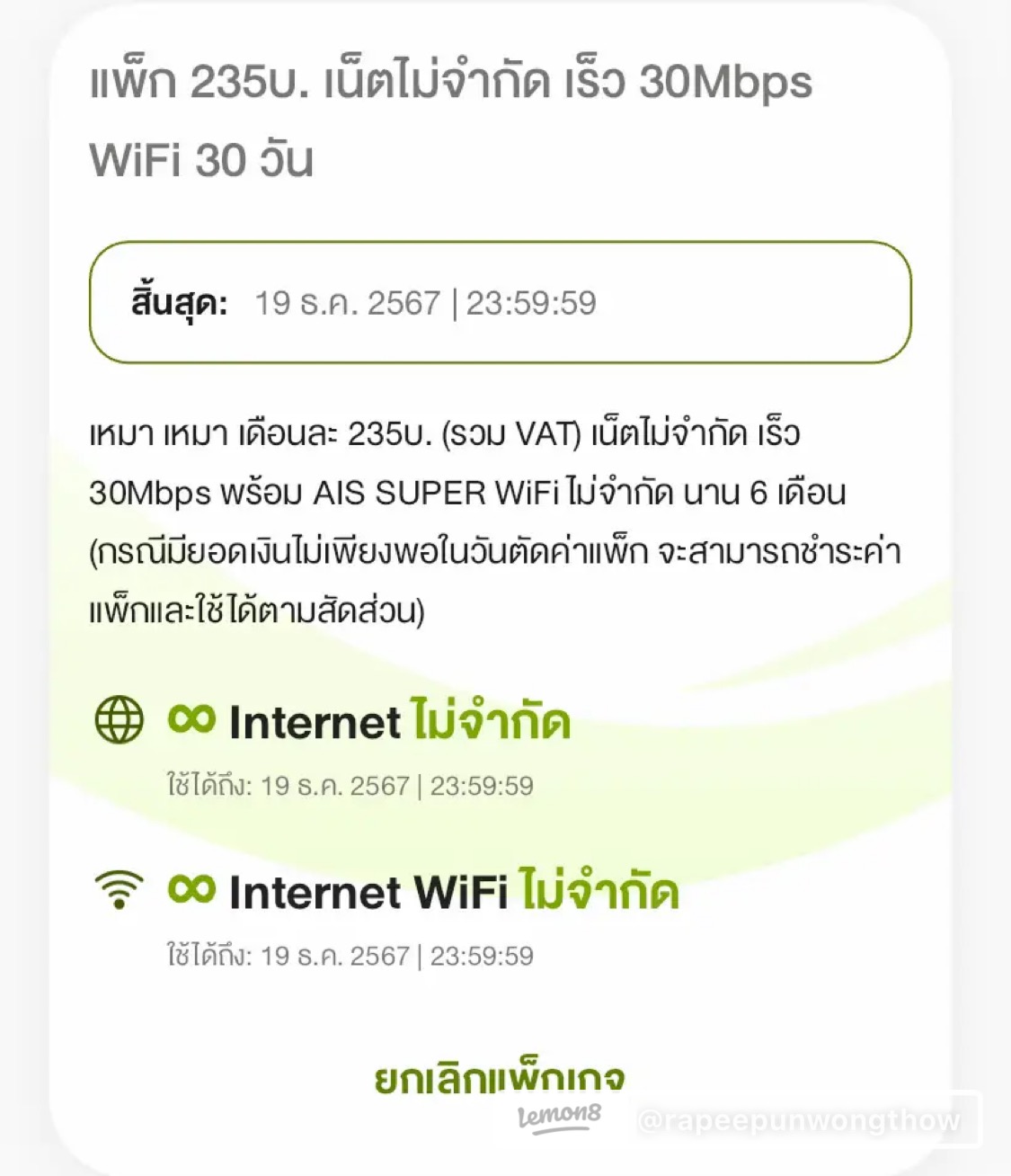 ต้องการสมัครแพ็กเกจหลักที่เป็น 30 วัน เลยสอบถามทางอุ่นใจในแอพพลิเคชั่น AIS แล้วอุ่นใจแนะนำมา 1 แพ็กเกจที่ระบุว่า 30 วัน พอสมัครและจ่ายเงินเสร็จ เราได้ทำการตรวจสอบแพ็กเกจกลับเป็น 1 สัปดาห์ เร◌าต้องทำยั