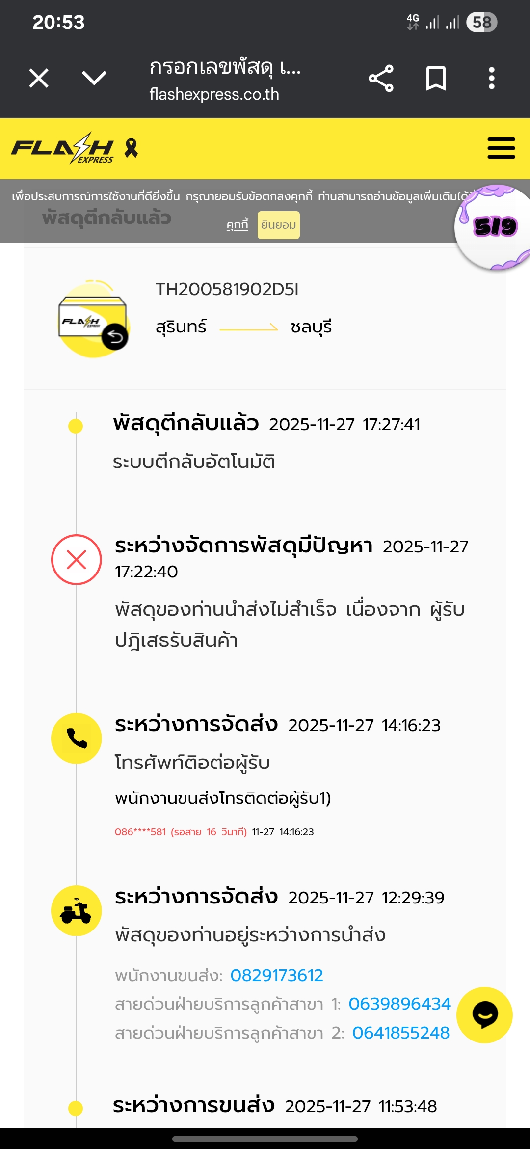 ทำไมของจะส่งถึงอยู่แล้ว flash ถึงตีกลับไปวังน้อย ส่งกลับไปหลับมา งง มาก ทักถาม chat ในเวปก็ไม่มีใครตอบ TH0126819QVW4C
