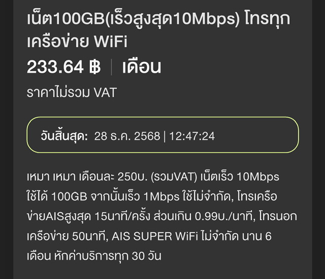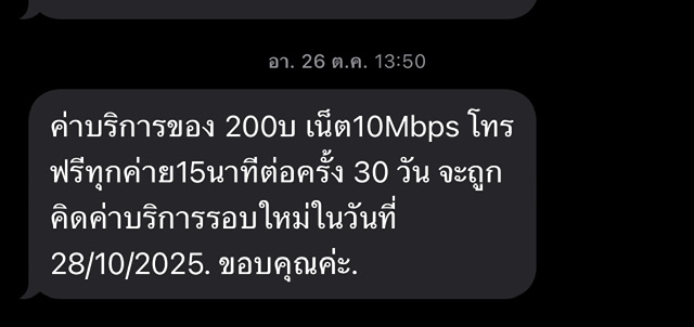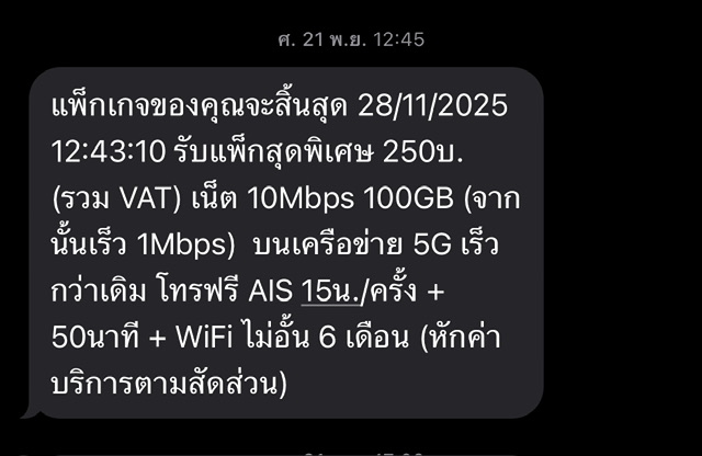 เลยเกิดความสงสัยว่าทำไมหักไป250บาท เลยเข้าไปค้นsms ก็เลยเจอว่าเมื่อ21 พ.ย. 68 ระบบแจ้งว่าแพคเกจจะสิ้นสุดวันที่ 28 พ.ย.68 และถ้าเติม250บาทจะได้รับแพคเกจเสริม(ตามรูปแนบ3) ******* ซึ่งปกติจะเป็นsmsแจ้งค่าบริการรอบถัดไป (แต่smsเป็นแจ้งแพคเกจสิ้นสุดแทน คือผมอ่านไม่ละเอียดเองคิดว่าเป็นsmsแจ้งเตือนค่าบริการเหมือนทุกเดือนก็เลยเติมไว้250บาทปกติ) < พอถึงวันมันก็หักไป250บาท เท่ากับต่อโปรใหม่เลย