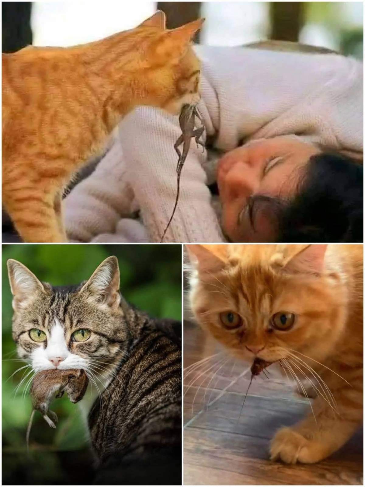 🐱แมวเป็นสัตว์ที่มีสัญชาตญาณนักล่า แม้จะอิ่มแล้วก็ยังสนุกกับการล่าอยู่ดี เมื่อเขาจับเหยื่อ (เช่น หนู, จิ้งจก) หรือ "เหยื่อสมมติ" (เช่น ของเล่น, ถุงเท้า, ยางรัดผม) ได้ การนำมาให้เจ้าของก็เหมือนกับการนำมาแบ่งปันในฐานะสมาชิก "ฝูง" หรือครอบครัวของเขา