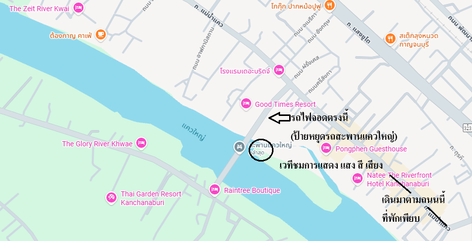 ลงตรงป้ายหยุดรถสะพานฯ เดินไปรับคูปองที่นั่ง (ฟรี) ที่ซุ้มตรงทางเข้าเวทีการแสดง