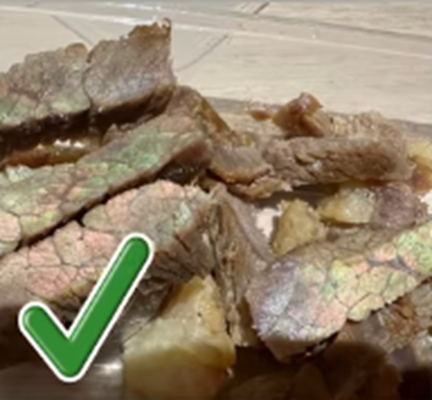 เนื้อปรุงสุกมีประกายรุ้ง (Iridescence) เมื่อแสงกระทบ ปรากฏการณ์ทางแสงจากการสะท้อนโครงสร้างกล้ามเนื้อ ตรงนี้ไม่มีอันตรายค่ะ ส่วนใหญ่มักจะเจอกันในพวกเนื้อแดง อย่างเช่นเนื้อวัว