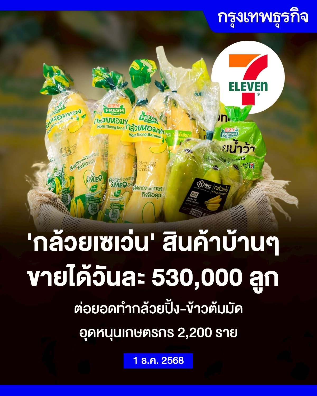 บริษัท ซีพี ออลล์ จำกัด (มหาชน) ผู้บริหารเซเว่น อีเลฟเว่น และเซเว่น เดลิเวอรี เปิดเผยว่า “กล้วยเซเว่น” ถือเป็นจุดเชื่อมต่อระหว่างแรงปลูกของเกษตรกรและความต้องการของตลาดสมัยใหม่ ปัจจุบัน “เซเว่น-อีเลฟเว่น” รับซื้อกล้วยสดจากเกษตรกรและเครือข่ายผู้รวบรวมกว่า 2,200 ราย จาก 43 จังหวัดทั่วประเทศ เฉลี่ยแล้วมีจำนวนมากถึง 530,000 ลูกต่อวัน โดยมี SMEs ผู้รวบรวมผลิตรับหน้าที่คัดเลือก ควบคุมคุณภาพ และบรรจุกล้วยที่ผ่านการตรวจสอบมาตรฐานก่อนส่งตรงไปยังร้านเซเว่น-อีเลฟเว่นทั่วประเทศ