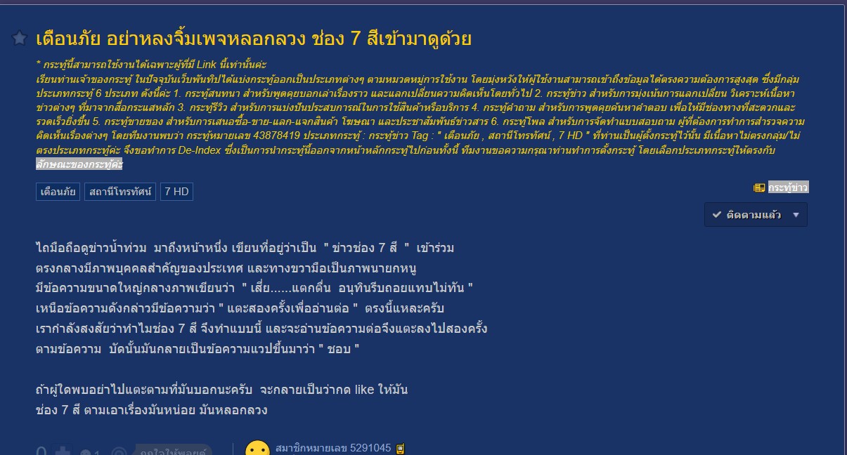 ไถมือถือดูข่าวน้ำท่วม มาถึงหน้าหนึ่ง เขียนที่อยู่ว่าเป็น " ข่าวช่อง 7 สี " เข้าร่วม