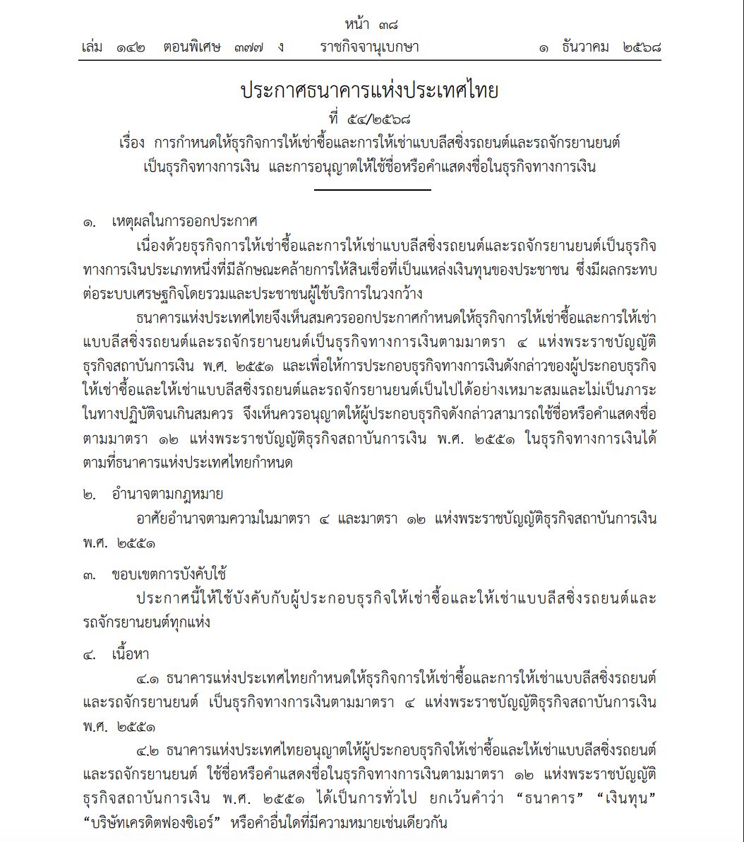 2 ธ.ค. 68 ธปท.คุมเข้มธุรกิจเช่าซื้อรถยนต์และลิสซิ่ง