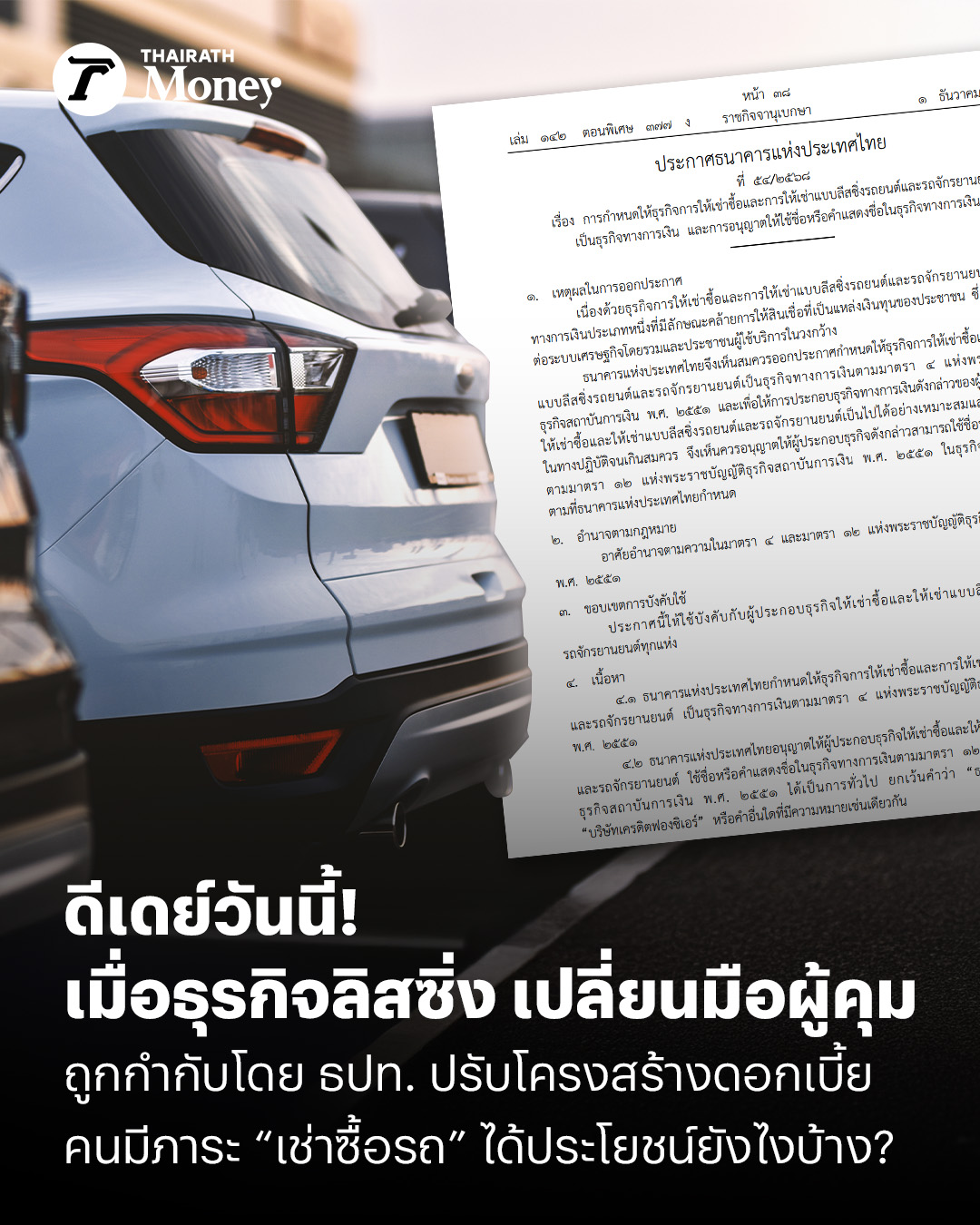 ซึ่งกำหนดให้ธุรกิจการให้เช่าซื้อและการให้เช่าแบบลีสซิ่งรถยนต์และรถจักรยานยนต์ เป็นธุรกิจทางการเงินอย่างเต็มตัว โดยให้มีผลบังคับใช้ตั้งแต่วันนี้เป็นต้นไป นั่นหมายความว่า ธุรกิจเช่าซื้อทุกแห่งจะถูกยกระดับให้เป็น "ธุรกิจทางการเงิน" และอยู่ภายใต้การกำกับดูแลของ ธปท. อย่างเป็นทางการตามพระราชบัญญัติธุรกิจสถาบันการเงิน พ.ศ. 2551