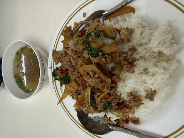 อร่อยกับเมนูง่ายๆ แต่มื้อเที่ยงนี้คือดีงามเกินคาด เริ่มจาก ต้มยำไก่ รสจัดจ้าน หอมกลิ่นตะไคร้ ใบมะกรูด และพริกขี้หนูที่ช่วยปลุกความสดชื่นในคำแรก ตามด้วย ทอดมันปลากราย เด้งแน่นกำลังดี เคี้ยวเพลินจนหยุดไ