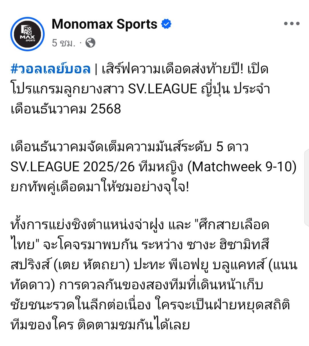 🏐 #วอลเลย์บอล | เสิร์ฟความเดือดส่งท้ายปี! 🧐 เปิดโปรแกรมลูกยางสาว SV.LEAGUE ญี่ปุ่น ประจำเดือนธันวาคม 2568 🔥