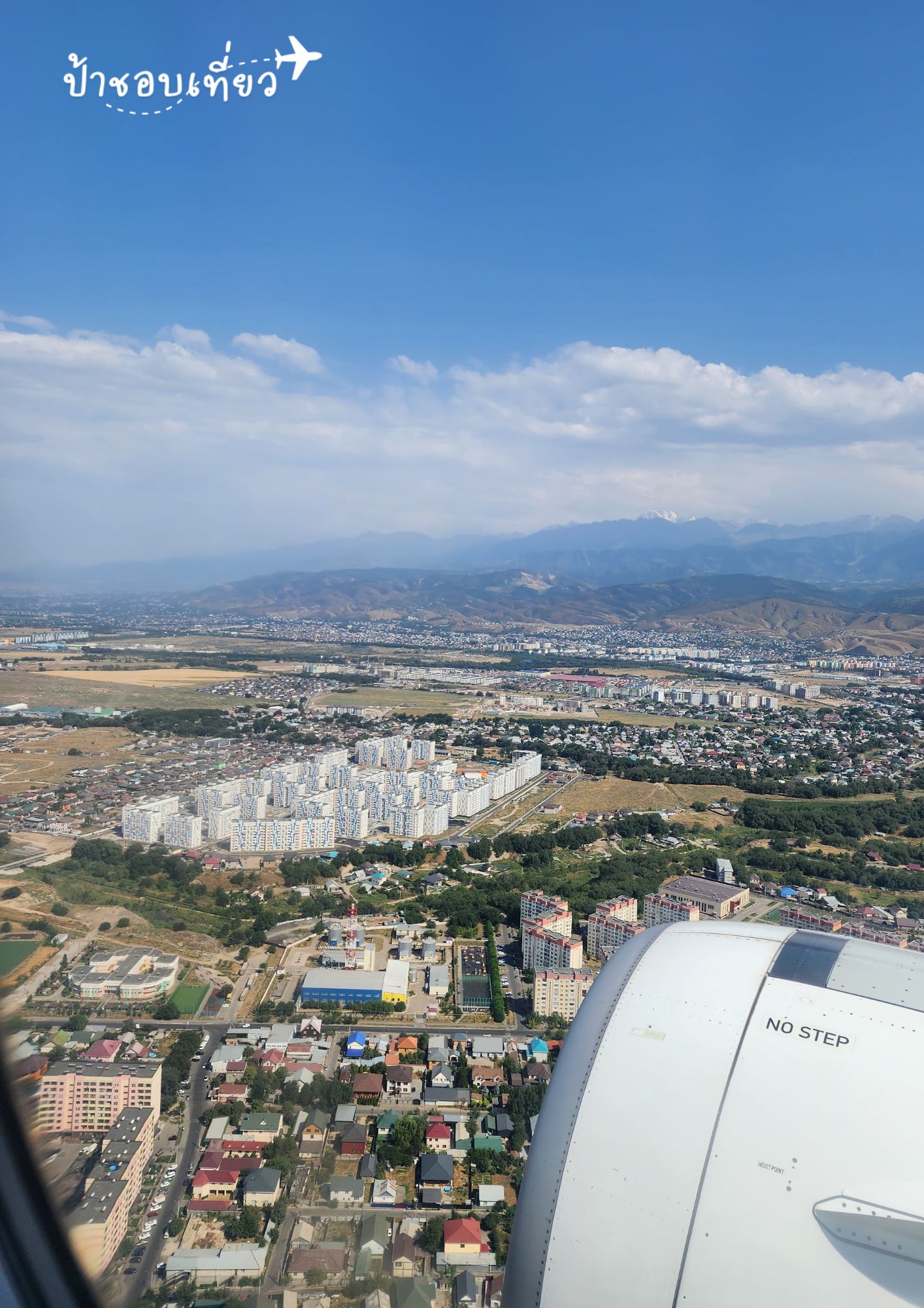 เมือง Almaty มองจากเครื่องบิน ภูเขาด้านหลังในภาพ เป็นแหล่งท่องสำคัญของคาซัคสถาน ป้าไปดูรีวิวแล้ว น่าไปทีเดียว