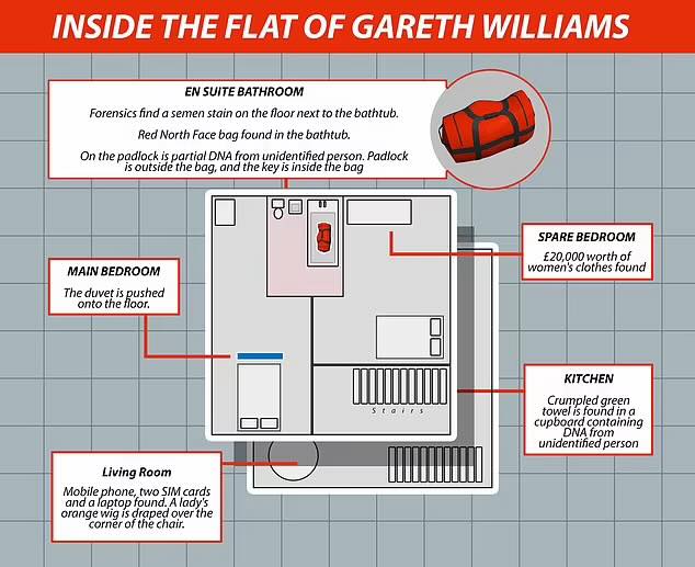 ภาพนี้เป็นแผนผังและข้อสรุปเกี่ยวกับสิ่งที่พบในอพาร์ตเมนต์ของแกเร็ธ วิลเลียมส์ ซึ่งเป็นรายละเอียดของคดีที่กล่าวถึงในภาพก่อนหน้า