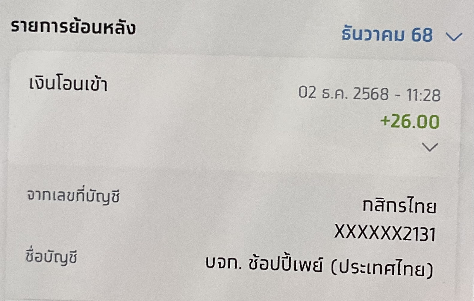 เหตุการณ์คือ ก่อนหน้านี้เคยขอคืนสินค้าในช้อปปี้และได้รับการอนุมัติเมื่อวันที่ 23 พ.ย. 2568 แล้วก็ได้รับเงินคืนแล้วเมื่อวันที่ 23 พ.ย. 2568 เวลา 17.30 ยอดเงิน 127 บาท แต่หลังจากนั้นมีการโอนเงินจาก Shopee เข้าบัญชีธนาคารกรุงไทย ในวันที่ 25 พ.ย. 2568 เวลา 19.00 ยอดเงิน 80 บาท รายการ TR from ……. shopeepay และในวันที่ 2 ธันวาคม 2568 เวลา 11.28 ยอดเงิน 26 บาท จากธนาคารกสิกรไทย บัญชี บจก. ช้อปปี้เพย์ (ประเทศไทย) ซึ่งไม่ทราบว่าเป็นยอดเงินจากอะไร เป็นไปได้ไหมว่าช้อปปี้โอนเงินผิด